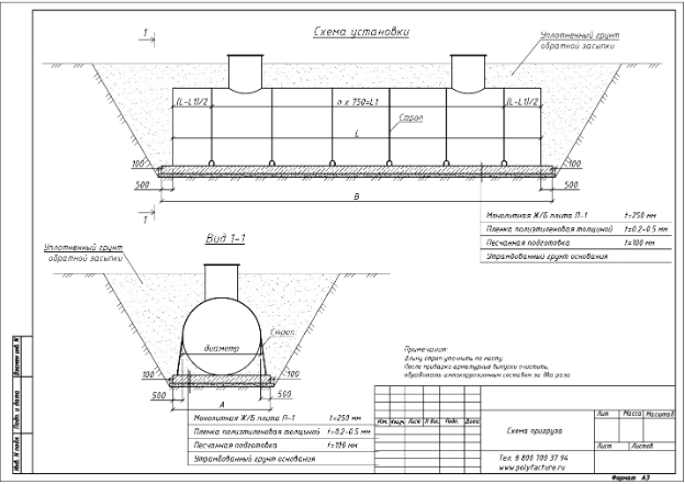 Все схемы устройства плиты, включая армирование и технические требования к проведению работ, подлежат согласованию с производителем резервуара.